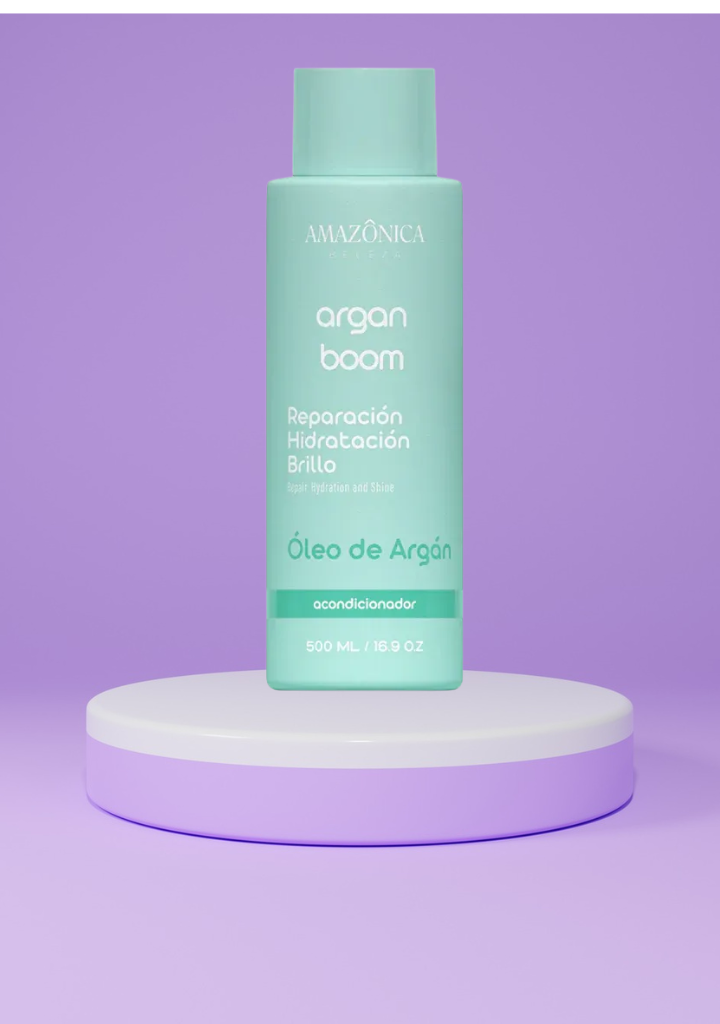 Después de lavar el cabello con shampoo, aplica el acondicionador sobre el cabello limpio y húmedo, de medios a puntas. Deja actuar 2–3 minutos y luego enjuaga con abundante agua. Úsalo junto con el shampoo y la mascarilla de la línea Argan Boom para mejores resultados.