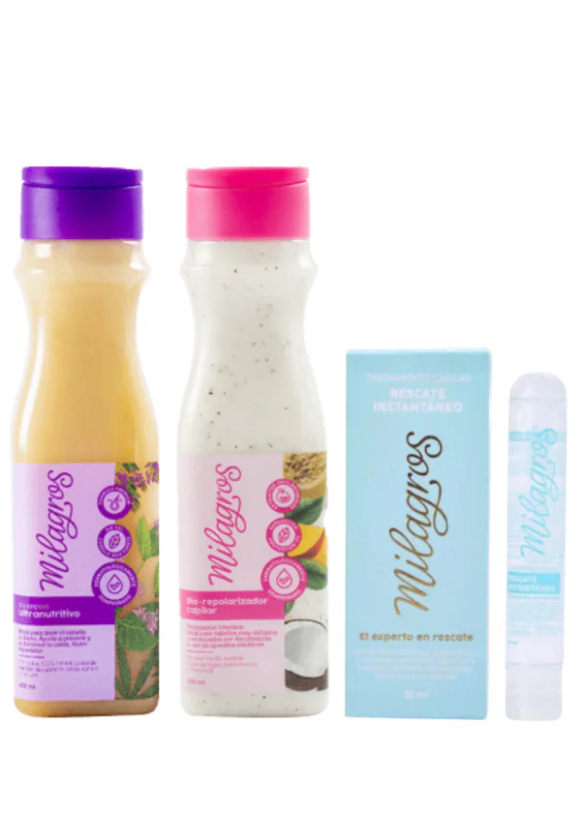 ¿Tu cabello está seco, quebradizo, maltratado o sin vida? El Kit Rescate Milagros ha sido creado especialmente para ti. Este poderoso tratamiento capilar intensivo está formulado para brindar una recuperación profunda y devolverle al cabello todo lo que ha perdido: fuerza, brillo, suavidad y vitalidad.