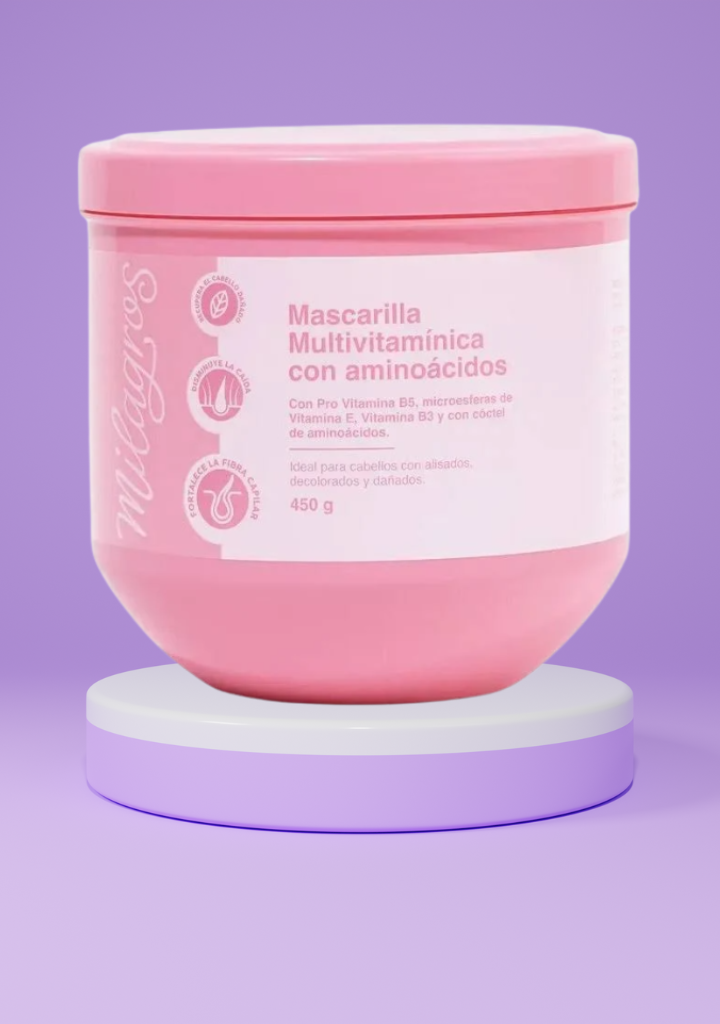 Transforma tu cabello con nuestro exclusivo coctel de aminoácidos diseñado para cabellos alisados, decolorados y dañados. La Mascarilla Capilar Multivitamínica Milagros no solo detiene la caída del cabello, sino que fortalece la fibra capilar desde la raíz hasta las puntas.