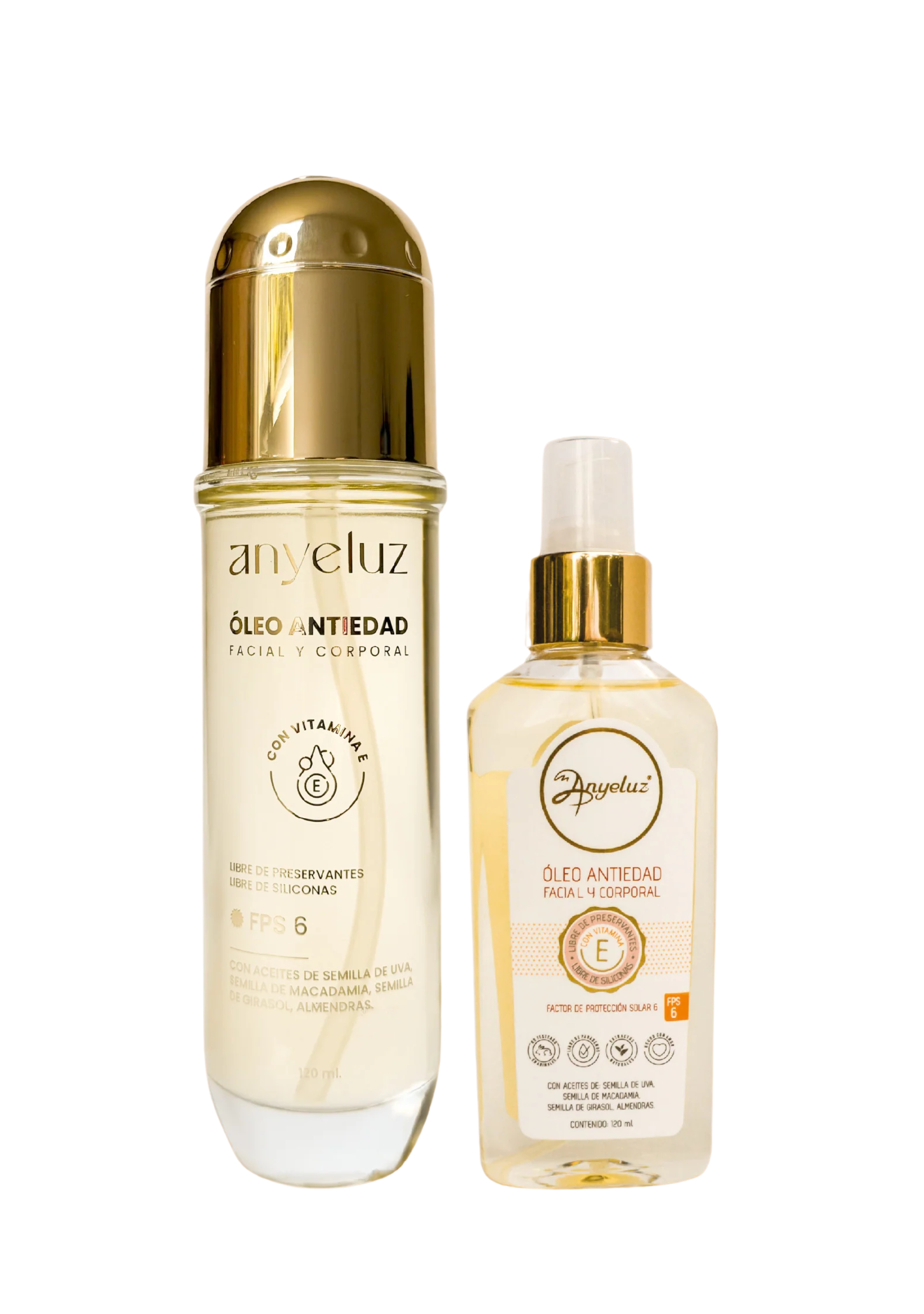 El Óleo Antiedad Anyeluz es una poderosa combinación de vitamina E y aceites ricos en ácido linoleico y otros ácidos grasos insaturados, diseñada para fortalecer la función natural de la barrera cutánea. Su fórmula avanzada se absorbe rápidamente, proporcionando una hidratación profunda sin dejar